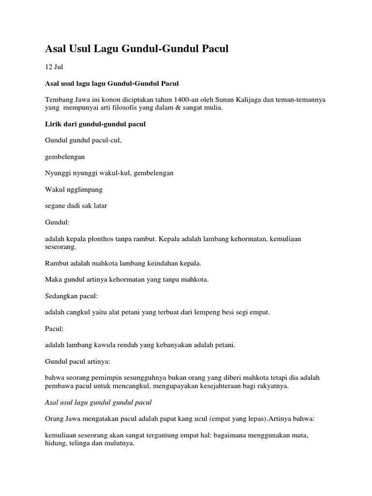 Gundul Gundul Pacul Lirik : Hardjosubroto, seorang komposer karawitan jawa. Gundul Gundul Pacul Lirik - Gundul gundul pacul cul gempelengan nyunggi nyunggi wakul kul gempelengan.