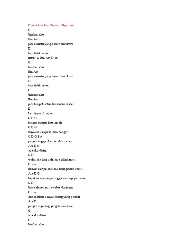 Kunci Gitar Dhyo Haw Ada Aku Disini / C d walau dia kini tlah lama dihidupmu g em namun sampai kini tak bahagiakan kamu am d g lupakan semuanya tinggalkan saja percuma.
