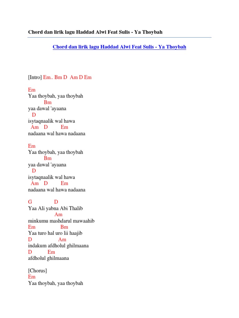 Chord Dan Lirik Lagu Haddad Alwi Feat Sulis Ya Thoybah - Yaa thoybah, yaa thoybah yaa dawal ayaana isytaqnaalik wal hawa nadaana wal hawa nadaana.