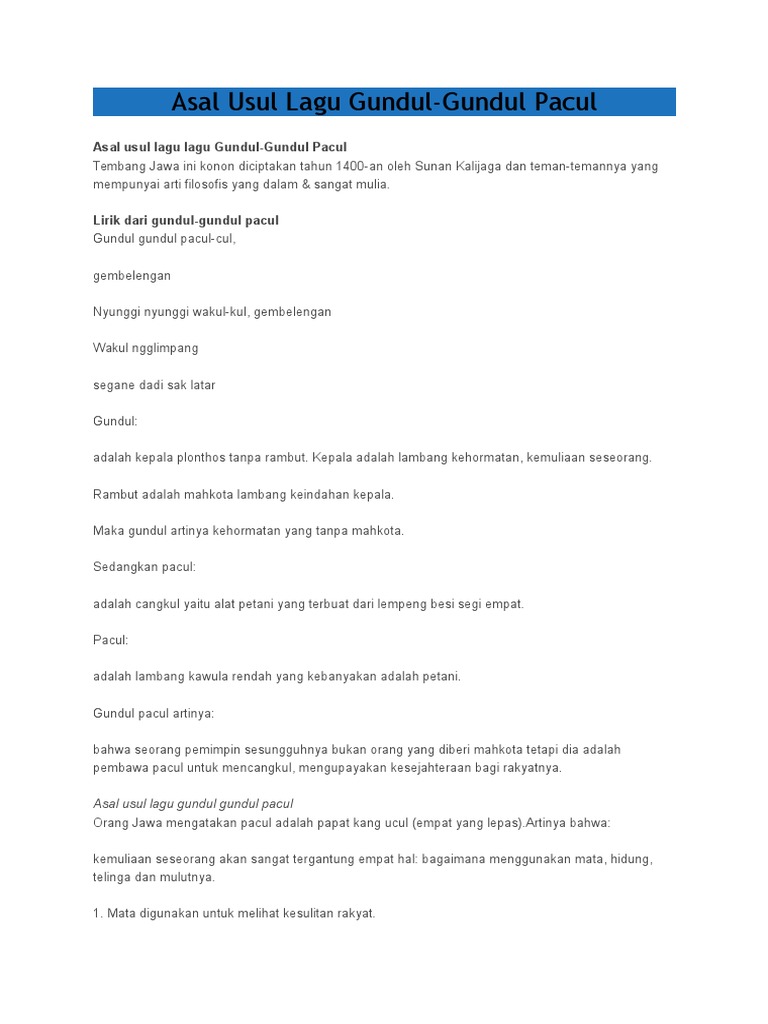 Makna Dari Lagu Gundul Gundul Pacul - Gundul pacul adalah sebuah lagu permainan berbahasa jawa yang berasal dari provinsi jawa tengah. Makna Dari Lagu Gundul Gundul Pacul : Lagu ini dianggap mengandung nilai filosofis yang dalam sebagai berikut: