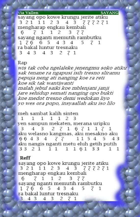 Not Angka Lagu Sayang Via Vallen Koleksi Not Angka - Hal itu dibuktikan dengan jumlah views videoklip lagu sayang yang menembus angka lebih dari 170 juta dalam kurun waktu kurang dari 2 tahun.