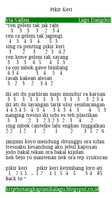 Not Angka Pianika Lagu Via Vallen Pikir Keri - Dibawah ini saya sajikan not angka,not.