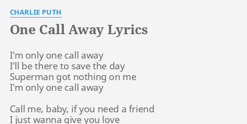 Charlie Puth One Call Away Lyrics Lyrics My - I'm only one call away i'll be there to save the day superman got nothing on me i'm only one call away call me, baby, if you need a friend i just wanna give you love c'mon, c'mon, c'mon reaching out to you, so take a chance no matter where you go you know you're.