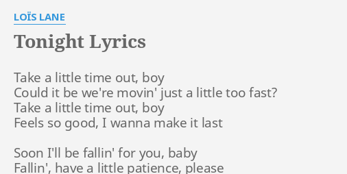 Tonight Lyrics By Lois Lane Take A Little Time - Just have a little patience i'm still hurting from a love i lost i'm feeling your frustration any m.