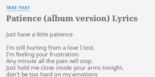 Patience Album Version Lyrics By Take That Just Have A Little - I'm still hurting from a love i lost, i'm feeling your frustration, that any minute all the pain will stop, just hold, me close, inside your arms, tonight, don't be too hard on my emotions, 'cause i, need time.