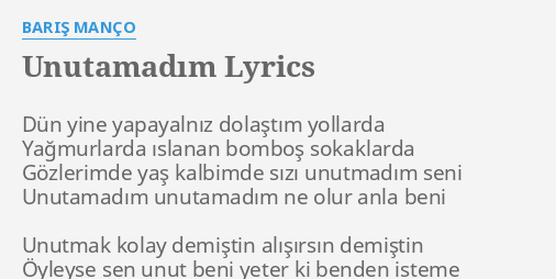 Unutamadım Sözleri Barış Manço - Provided to thexvid by netd muezik video dijital platform a.s. Unutamadım Sözleri Barış Manço / Duen yine yapayalniz dolastim yollarda yagmurlarda islanan bombos sokaklarda goezlerimde yas kalbimde sizi.