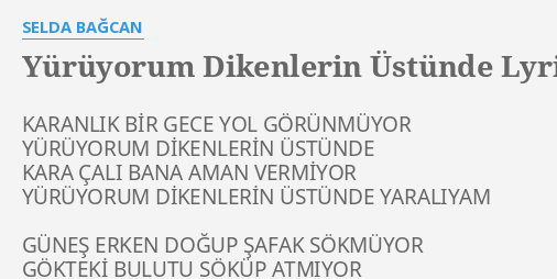 Yürüyorum Dikenlerin Üstünde Şarkı Sözleri : Karanlik bir gece yol goeruenmueyor, yuerueyorum dikenlerin uestuende. Yürüyorum Dikenlerin Üstünde Şarkı Sözleri - Karaniik bir gece yoi goeruenmueyor, yuerueyorum dikenierin uestuende.
